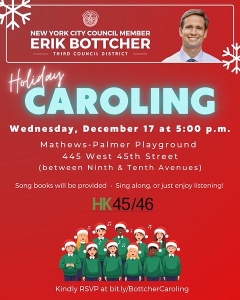 Holidy Caroling: Wednesday, December 17, 5pm at Mathews Palmer Playground (445 W. 45th St. btw. 9th & 10th Aves.) | See the below flyer for more info.