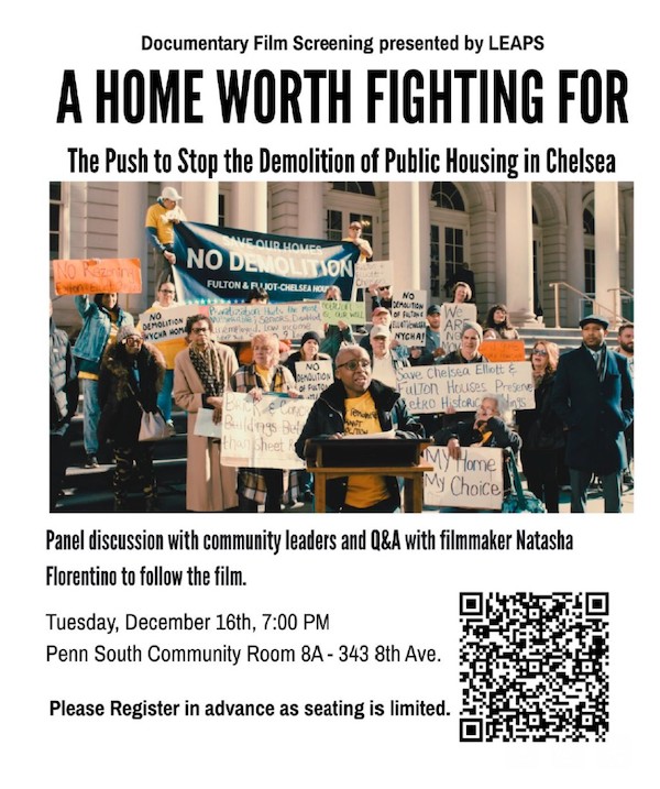 Free Screening of A Home Worth Fighting For: The Push to Stop the Demolition of Public Housing in Chelsea / Tuesday, December 16, 7pm in Penn South’s Community Room 8A (343 Eighth Ave.) | Fresh off the positive buzz from last week’s world premiere at The People’s Forum, director Natasha Florentino’s 40-minute, pro-tenant documentary gets another free screening, this time mere footsteps from where the film’s high-stakes events continue to unfold. A Home Worth Fighting For follows longtime Chelsea residents who organize to resist the “flawed political process” they say favors a “profit-driven plan aimed at privatizing public housing.” As we wrote in advance of last week’s screening, efforts to resist have “taken on new urgency as of late, with the first wave of Chelsea’s NYCHA tenants placed into temporary living spaces while the much-opposed demolition and construction plan begins to unfold.” Questions? Comments? Bring them to the panel discussion with tenant leaders and the filmmaker, set to take place right after the screening. Facilitating the event is LEAPS (Limited Equity & Affordability at Penn South), whose membership has been vocal and unapologetic in their support of nearby NYCHA residents. Admission is free, but space is limited–hence LEAPS’ request that you register in advance (click here to do so). Can’t make it to Penn South on December 16? “Please note,” says the Coordinating Committee, “there will be more screenings organized around the city in the Spring – we will update you!” (Click here to send them an email request to join the LEAPS subscriber list.)