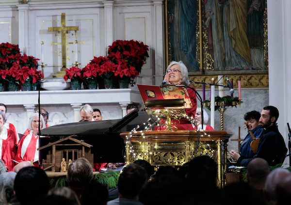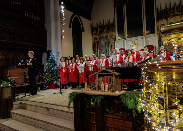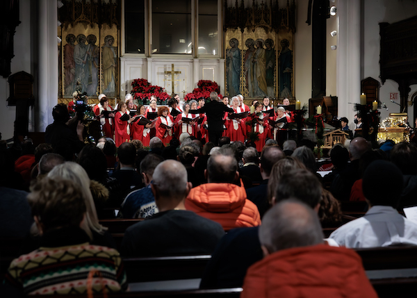 Chelsea Community Church presened its 51st Annual Candlelight Carol Service on Sunday, December 14, at St. Peter’s Church Chelsea (346 W.  20th St. btw. 8th & 9th Aves.). The non-denominational Christian congregation that welcomes all, all year long, long ago established this Candlelight Service as one of Chelsea’s essential holiday destination events. Its centerpiece: A reading of A Visit from St. Nicholas. Attributed to Chelsea’s Clement Clarke Moore, the iconic 1822 poem’s reindeer, chimney, and stocking stuffing lore lives on in the Santa Claus we know to this day. This year, Broadway star and Chelsea resident Karen Mason (Mamma Mia, Sunset Boulevard) read the poem live, at the actual church Moore helped design and build. To visit CCC online, click here–and to view a recording of 2025’s Candlelight Service, click here. See below, several photos from the Service.