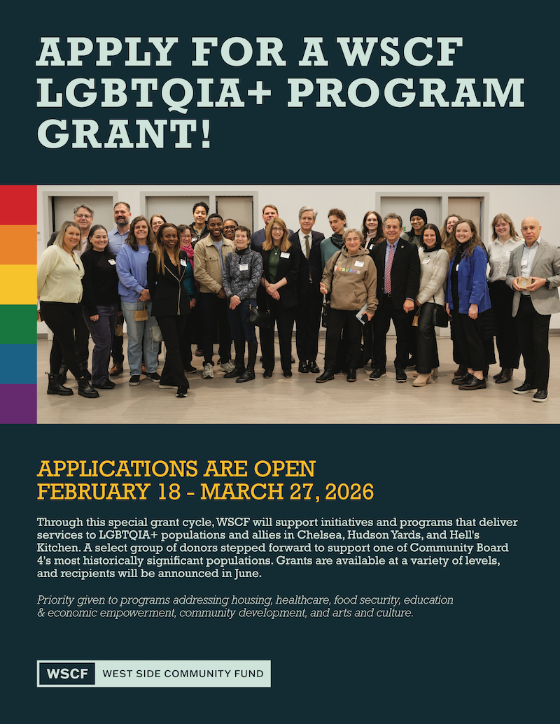 West Side Community Fund Spring 2026 Grant Cycle Focuses on LGBTQIA+ Projects / Applications Accepted Through March 27 | The West Side Community Fund–a consortium of companies whose biannual grant program typically distributes $100,000 per cycle to local community health centers, food pantries, non-profits, arts programs, and more–recently announced the dedication of their Spring 2026 cycle to initiatives benefitting the LGBTQIA+ communities of Chelsea, Hudson Yards, and Hell’s Kitchen. Priority will be given to projects addressing housing and people experiencing homelessness; healthcare access; food security; education and economic empowerment; community development; arts and culture; and other programs centered around the needs of underserved populations. Apply at westsidecommunityfund.org, where you’ll also find info on this grant cycle’s eligibility requirements. Questions? Email WSCF@hudsonguild.org.