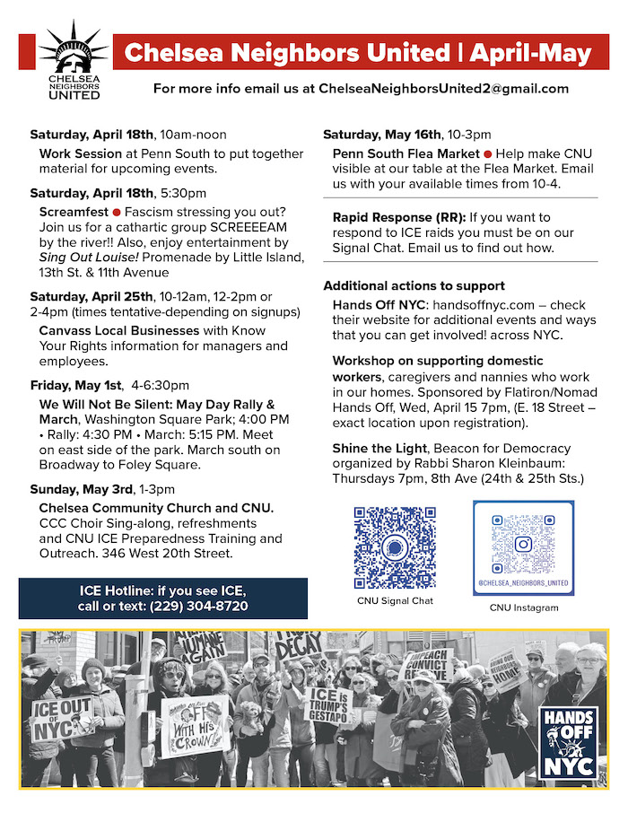 In April & May, From Chelsea Neighbors United | Let freedom ring! Chelsea Neighbors United—the action-oriented group with a knack for showing up and standing firm when liberty is at risk—has a robust slate of actions and activities coming up, as the below flyer notes. Said the Neighbors, upon its release: “Please take a look at the calendar below and also fill out the interest form, so we have an idea of what you’re interested in working on.” Access that interest form by Clicking Here.