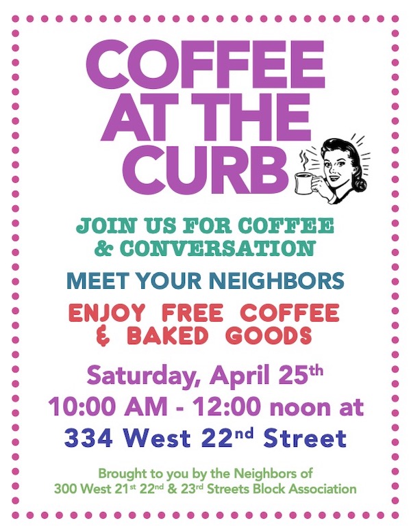 Coffee at the Curb: Saturday, April 25, 10am to noon at 334 W. 22nd St. | The Neighbors of 300 West 21st, 22nd, & 23rd Streets Block Association sponsor this opportuniy for casual conversation, encouraged by a considerable supply of complimentary coffee and baked goods. See the below flyer for all of the information you just read about, presented in a more visualluy appealing format…