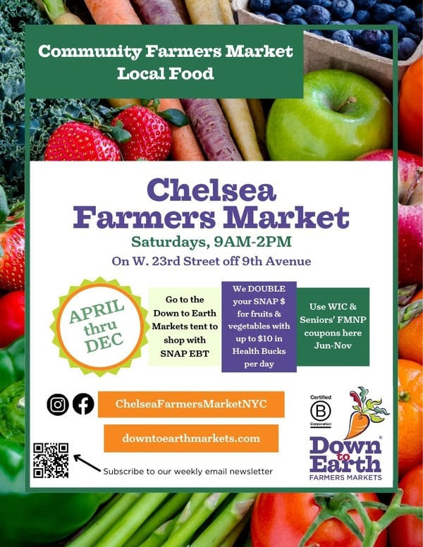 Down to Earth Farmers Market Chelsea: Saturdays, 9am-2pm on West 23rd St. off Ninth Ave. | See the below flyer for details.