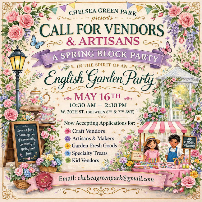 Call for Vendors & Artisans | Friends of Chelsea Green, programmers of attractions and activities at West 20th Street’s Chelsea Green Park, is on the lookout for vendors and artisans to be part of May 16’s English Garden Party. See the below flyer for details.