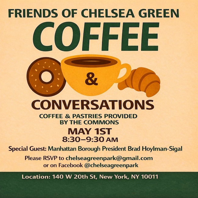 Coffee & Conversations with Special Guest, Manhattan Borough President Brad Hoylman-Sigal on Friday, May 1, 8:30am to 9:30am at Chelsea Green Park (W. 20th St. btw. 6th & 7th Aves.) | Join special guest: Manhattan Borough President Brad Hoylman-Sigal for coffee and pastries, generously provided by the Commons Chelsea. Said event sponsor Friends of Chelsea Green in a recent email, “Whether new to the neighborhood or a longtime resident, this is an excellent opportunity to build community and share ideas.” RSVP here: https://www.facebook.com/share/17wLy43Rtc/.